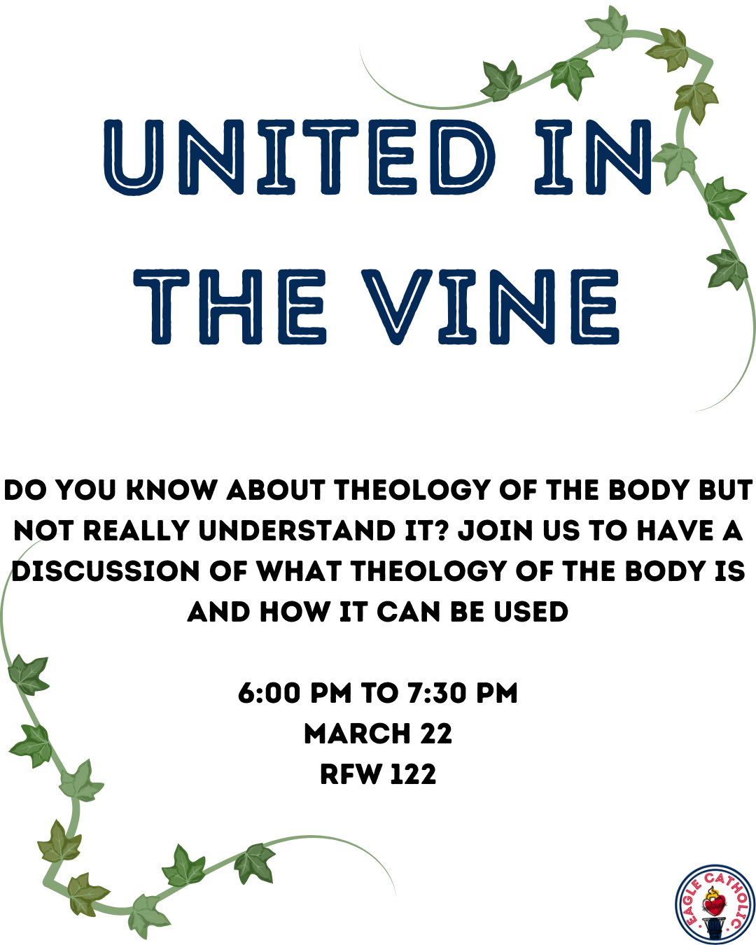 On the fourth Sunday of the month, there will be another discussion for United in the Vine. This discussion will be about Theology of the Body. Everyone is welcome to join. There will be snacks provided.