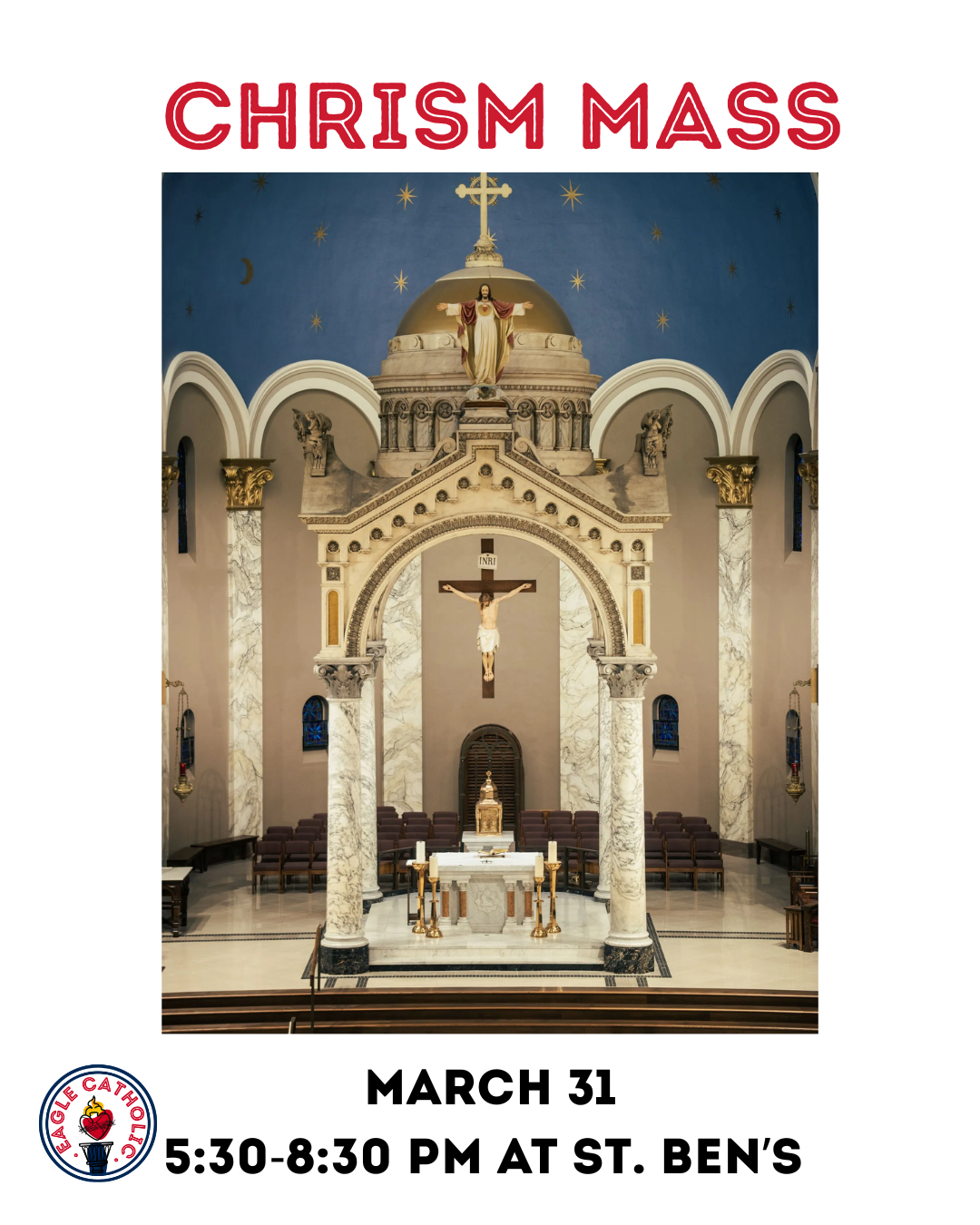 The Chrism Mass is March 31st at 5:30 pm. We advise you get to St. Ben’s early to be able to park your car and get to Mass on time to have a seat. There is a google form in the Group Me that we ask that you fill out so we know how many seats to reserve for Mass.