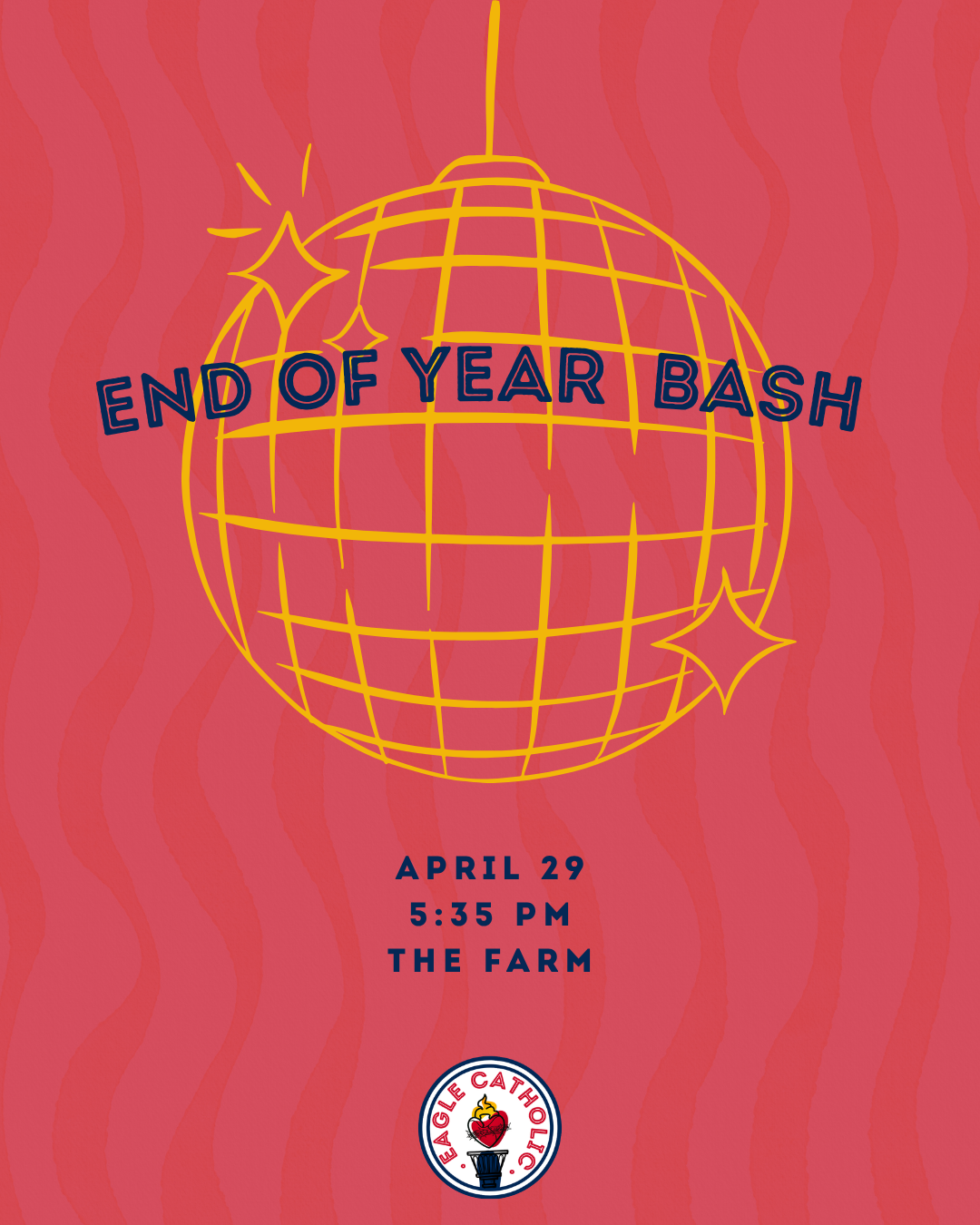 Next week will be having an end of the year bash at the Farm. There will be Adoration and Mass beforehand on campus. We will have yard games and will be grilling out. Please bring a friend so we can all celebrate the end of the school year!