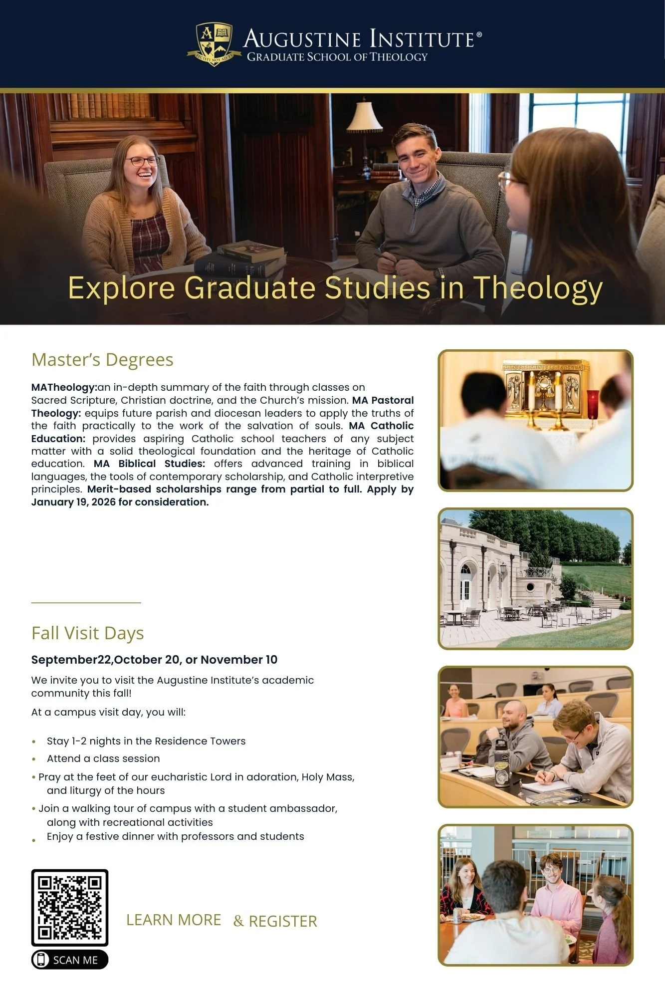 Dates: September 22, October 20, or November 10. Register here.Visit * We are hosting monthly visit days for prospective students where they can sit it on a class, attend Mass, stay in the residence towers, and meet the faculty and students. * Accommodations, meals, and the event itself are covered by the Augustine Institute. * Full Tuition Scholarship Deadline
